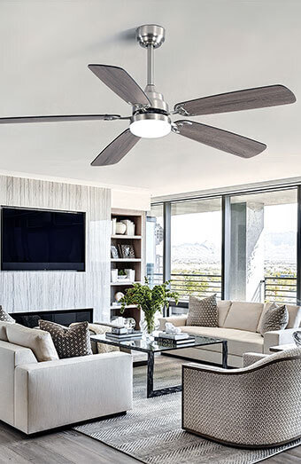 Professional installation of new ceiling fans in bedrooms, living rooms, patios, and offices, with options including standard, low-profile, and custom mounting heights.